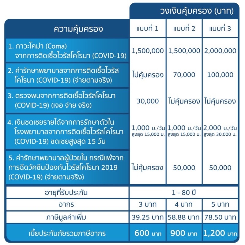 เมืองไทยประกันภัย (mti) ออกผลิตภัณฑ์ประกันภัยไวรัสโคโรนา 2019 แผน 1 stop (วันสต๊อป) คุ้มครองแบบครบถ้วนในหนึ่งกรมธรรม์ น้องใหม่ล่าสุด เบี้ยประกันภัย. เมืองไทยประกันภัย เบี้ยประกัน 600 บาท เจอปุ๊บ จ่าย 30,000 บาท หากโคม่าหรือเสียชีวิตจ่าย 1,500,000 บาท บริษัท เมืองไทยประกันภัย จำกัด (มหาชน) 252 ถ.รัชดาภิเษก แขวงห้วยขวาง เขตห้วยขวาง กรุงเทพฯ 10310 โทร. ลูกค้าเมืองไทยประกันชีวิต อุ่นใจได้ ฉีดวัคซีน โควิด 19 อย่างมั่นใจ แม้กรณีแพ้หรือเกิดผลข้างเคียง เพียงมีกรมธรรม์ที่มี. เมืองไทยประกันภัย แจกประกันแพ้วัคซีนโควิด 2 ล้านสิทธิ์ คุ้มครอง 1 แสน เริ่มเปิดลงทะเบียนตั้งแต่ 20 พ.ค.